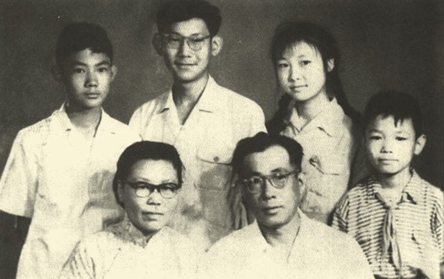 1959年遇罗克一家的合影。前排(从左向右):王秋琳,遇崇基。后排(从左向右):遇罗文、遇罗克、遇罗锦、遇罗勉。